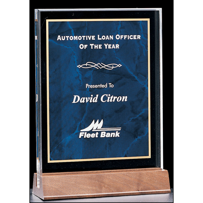 3/4" thick polished acrylic award with an marble center on a solid American walnut base. Presentation boxes not included.