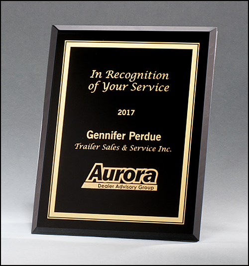 Black glass plaques with silver or gold borders. Easel back allows for either desktop display or wall mounting.