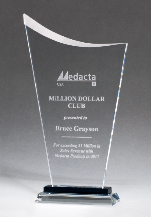 Contemporary clear glass award with pedestal base. Thick clear glass suitable for laser engraving or sand etching. Supplied with padded, satin-lined, gift box.