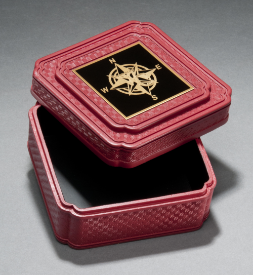 Red acrylic jewelry box with ornate design. Laser engravable brass plate. Gift boxed. 3.75 x 3.75 x 2