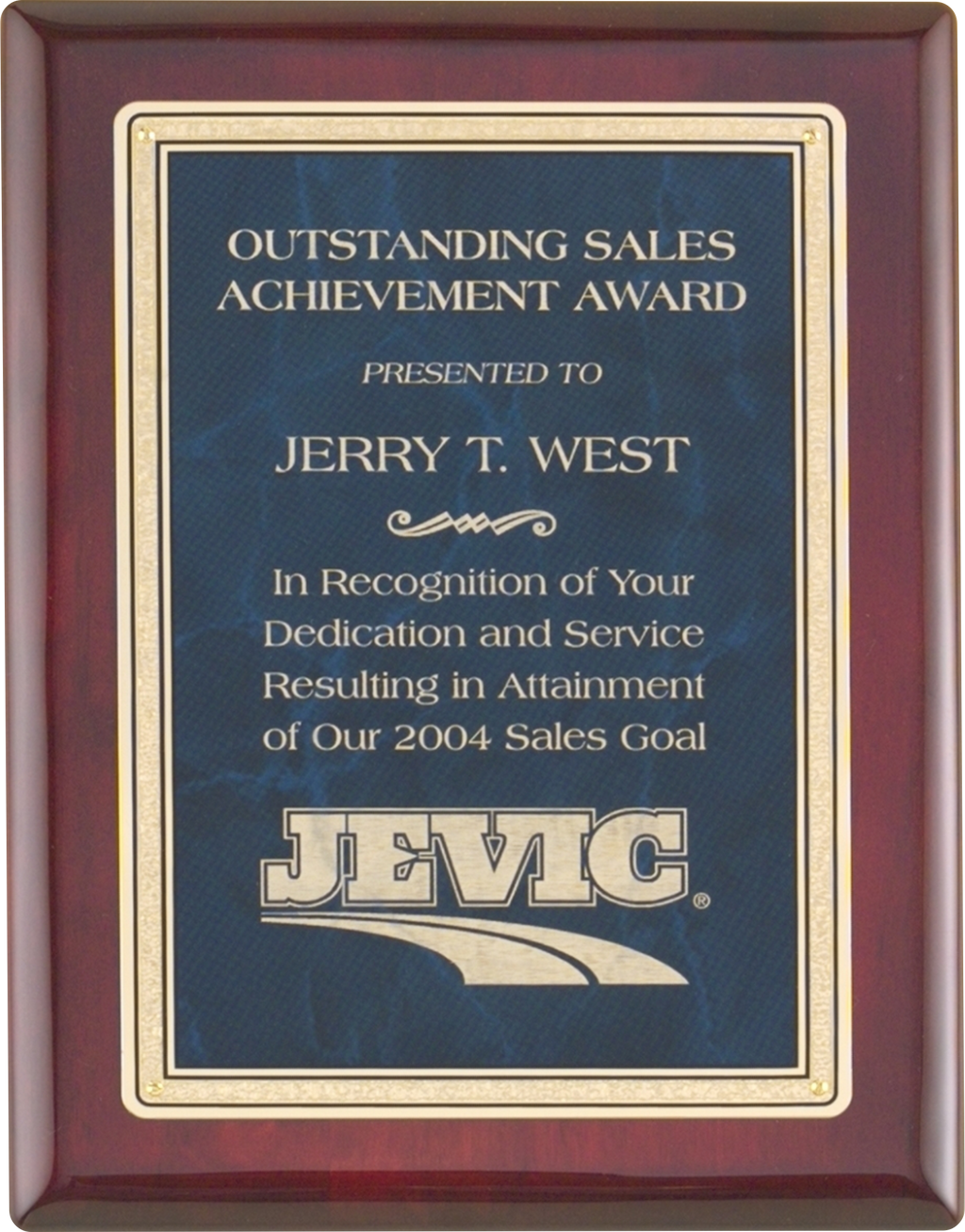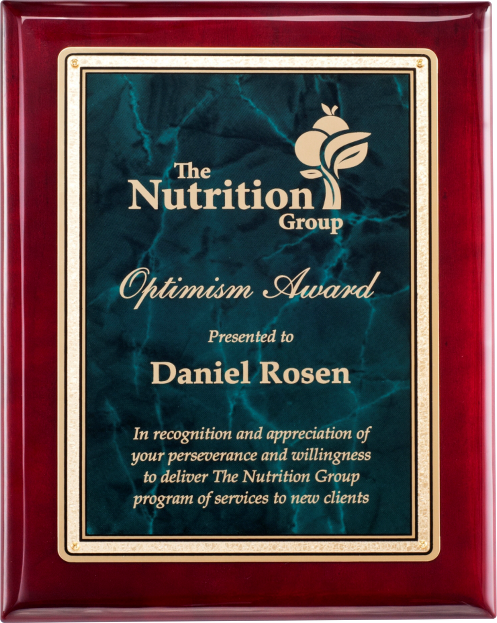 Rosewood stained piano finish board, marble design center plate with Florentine border. Available in three colors: sapphire, ruby and emerald. The same production techniques used to give expensive grand pianos their glossy look is available as a recognition award. Over six layers of lacquer are hand applied and polished to create our plaque boards. Laser engravable plate(s). Solid brass engraving plate(s). Individually boxed.